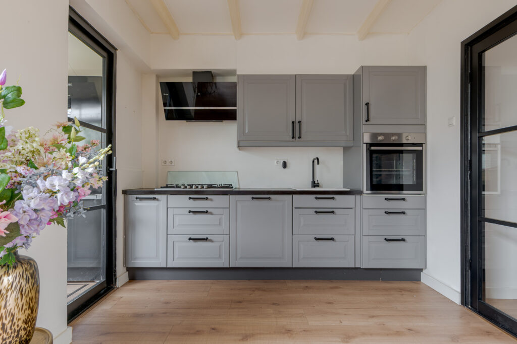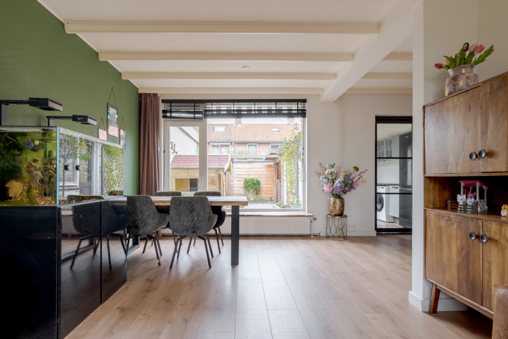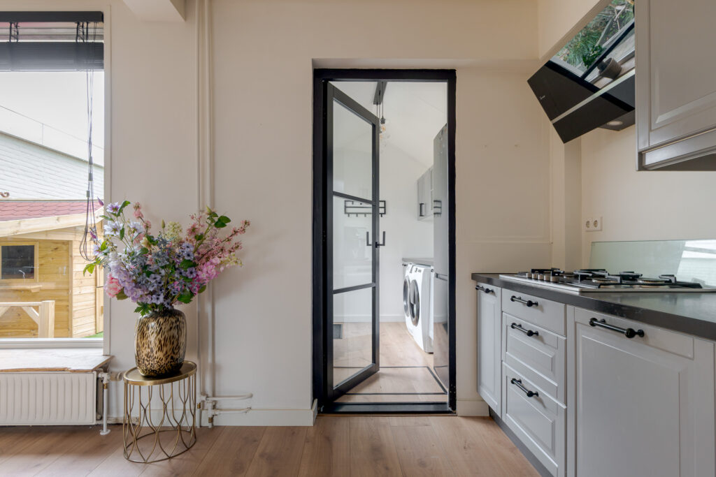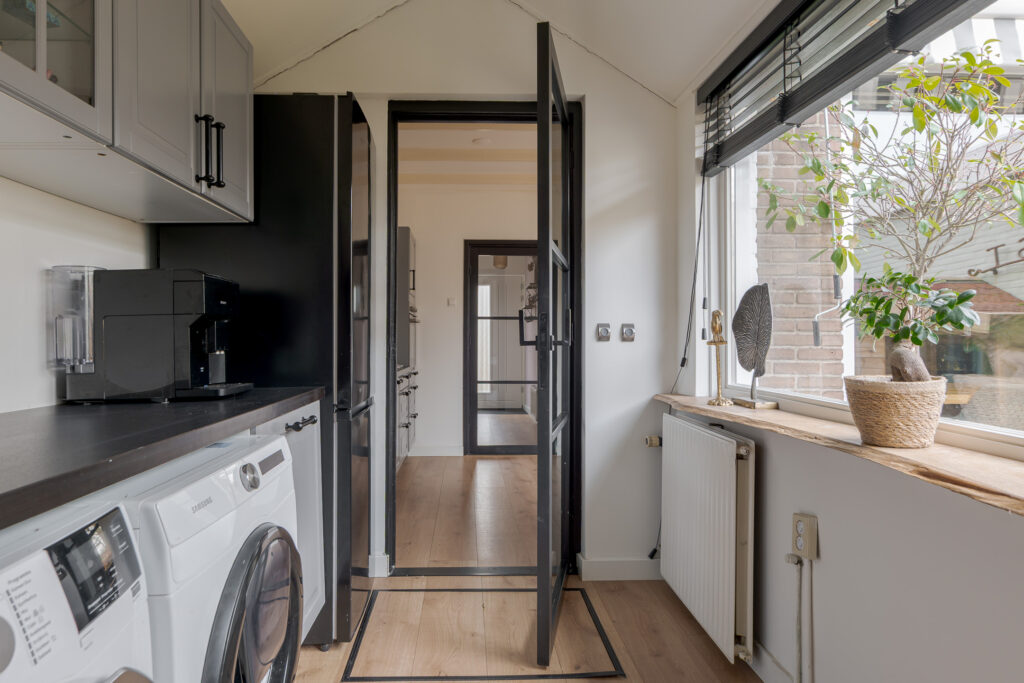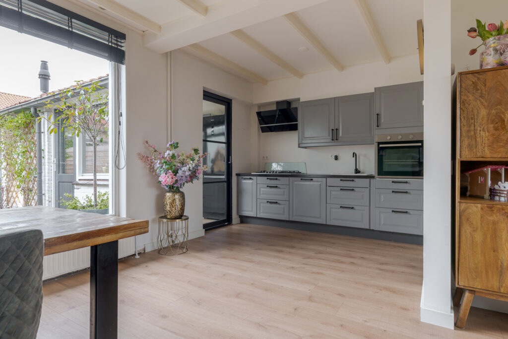 Via de hal bereikt u het toilet, de trapopgang, provisieruimte en de woonkamer. De woonkamer is licht dankzij de ramen aan voor- en achterzijde en is afgewerkt met een mooie laminaatvloer. De keuken sluit hierop aan en is uitgevoerd met grijze kastfronten en een donker werkblad. U vindt hier een gaskookplaat, afzuigkap, oven, vaatwasser en voldoende kastruimte. De keuken is geplaatst in 2014 en een deel van de inbouwapparatuur is de afgelopen jaren vernieuwd. Aangrenzend bevindt zich de bijkeuken met aansluitingen voor wasmachine en droger.