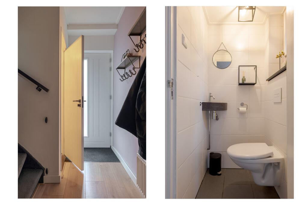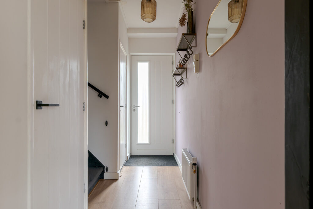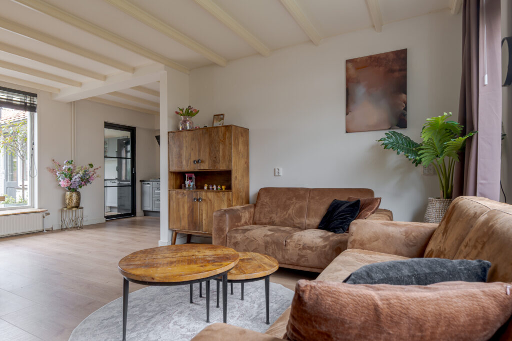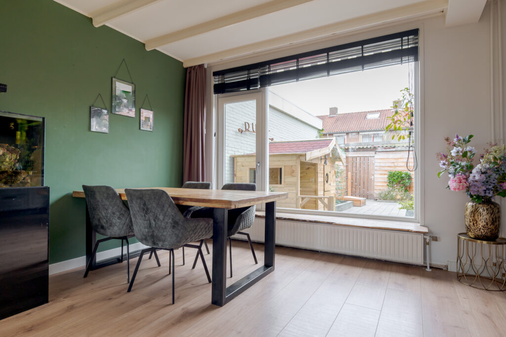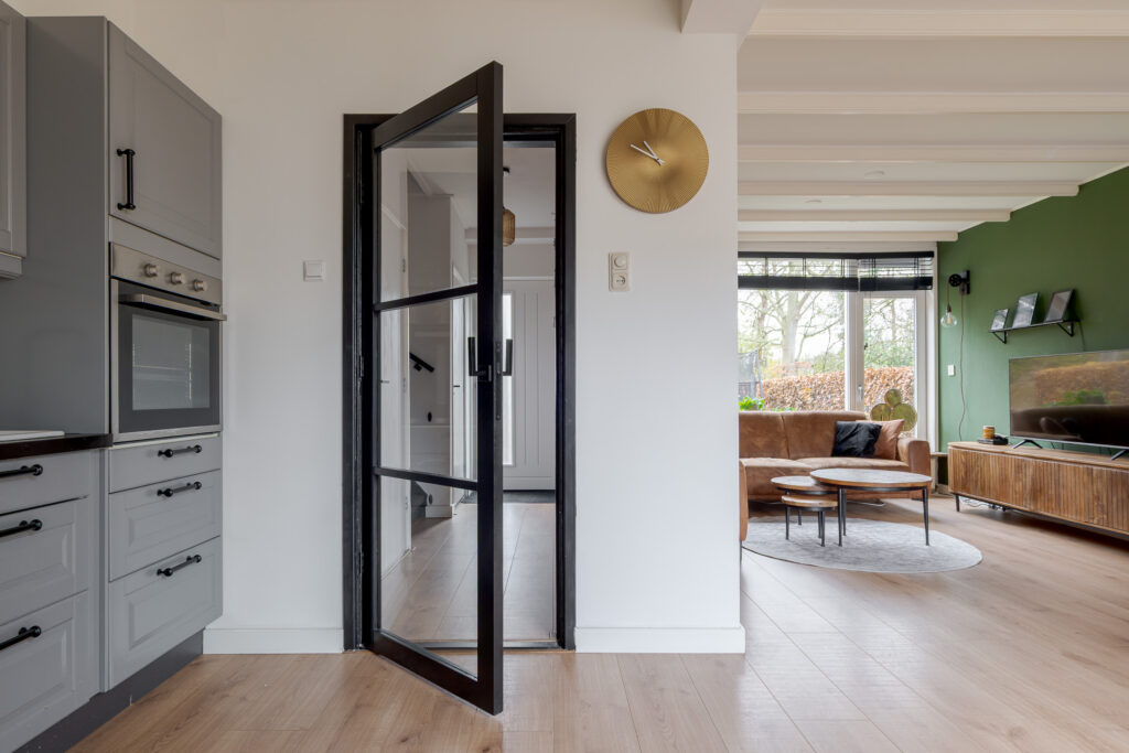 Via de hal bereikt u het toilet, de trapopgang, provisieruimte en de woonkamer. De woonkamer is licht dankzij de ramen aan voor- en achterzijde en is afgewerkt met een mooie laminaatvloer. De keuken sluit hierop aan en is uitgevoerd met grijze kastfronten en een donker werkblad. U vindt hier een gaskookplaat, afzuigkap, oven, vaatwasser en voldoende kastruimte. De keuken is geplaatst in 2014 en een deel van de inbouwapparatuur is de afgelopen jaren vernieuwd. Aangrenzend bevindt zich de bijkeuken met aansluitingen voor wasmachine en droger.
