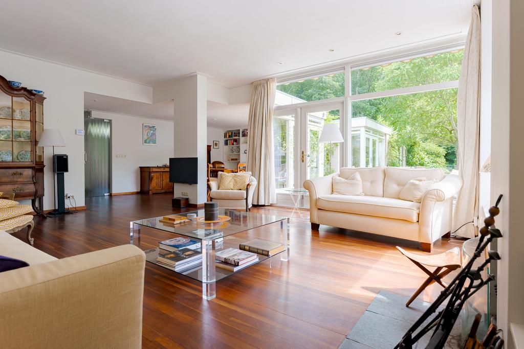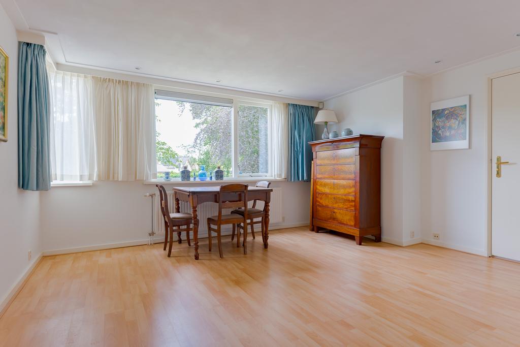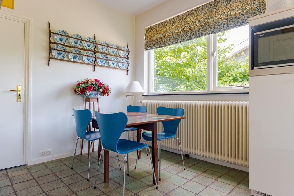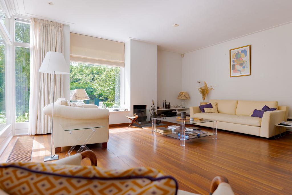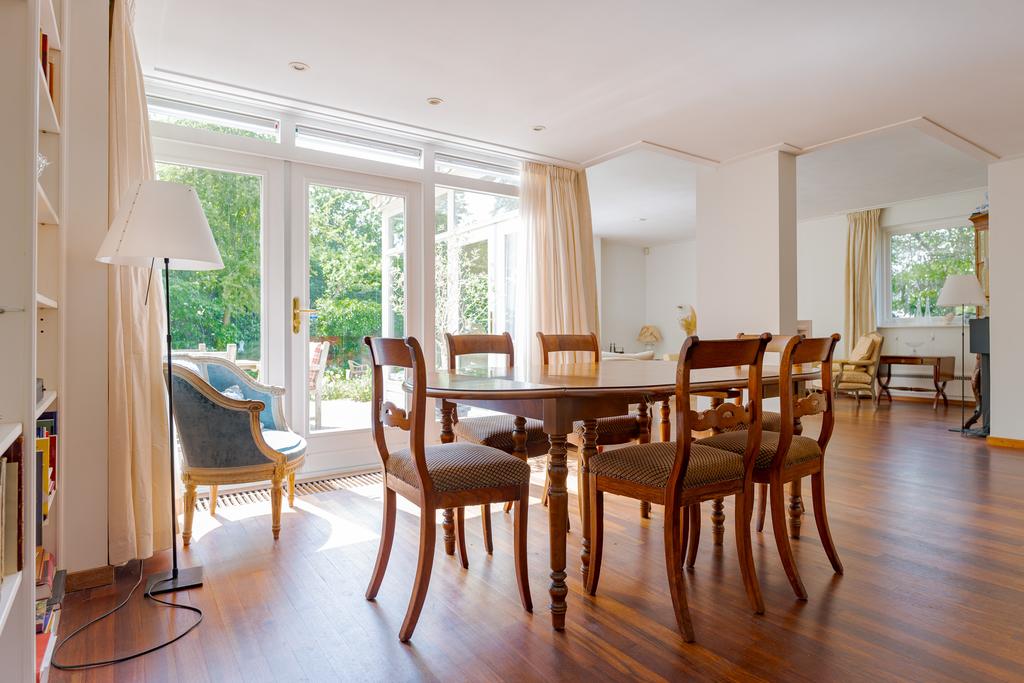 De tuingerichte woonkamer met eetkamer zijn voorzien van talrijke raampartijen met uitzicht naar de tuin, dit zorgt voor veel lichtinval en een mooie verbintenis tussen binnen en buiten. Via de 2 openslaande deuren loopt u zo de tuin in. Genieten van een goed boek bij de sfeervolle openhaard maakt uw dag compleet! Op warme zomerdagen geeft de airco een fijne verkoeling.