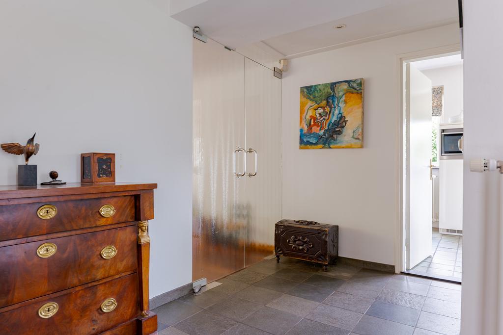 Entree via een royale hal. Vanuit hier heeft u toegang tot diverse vertrekken. Te beginnen bij de keuken. De Poggenpohl keuken is afgewerkt in een lichte kleurstelling en voorzien van een oven, magnetron, gasfornuis, afzuiginstallatie en vaatwasser. Daarnaast biedt de keuken voldoende ruimte voor het plaatsen van een eettafel. Via een tussenhal waar de wasmachine en droger opgesteld staan kunt u met een trap naar de garage.