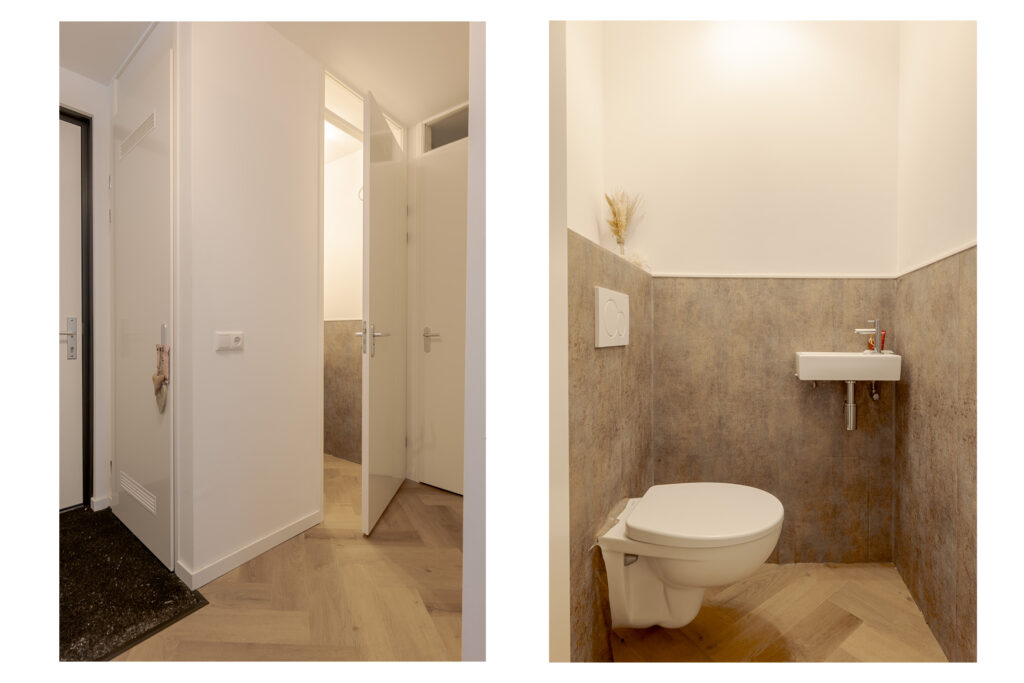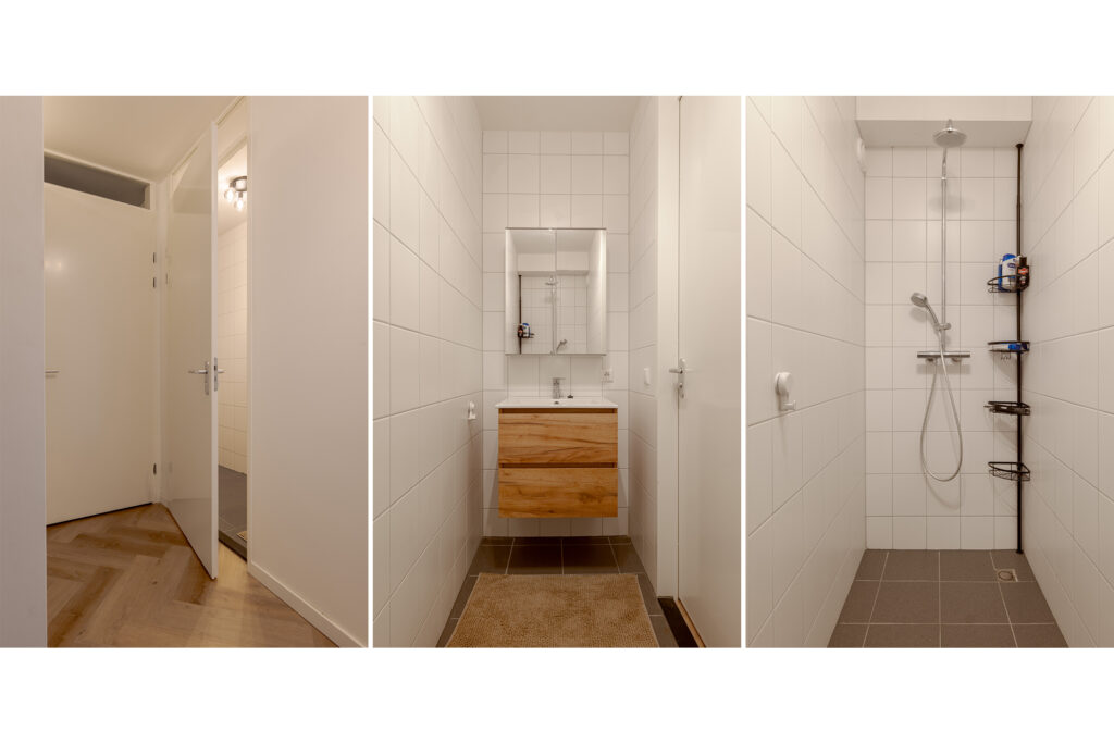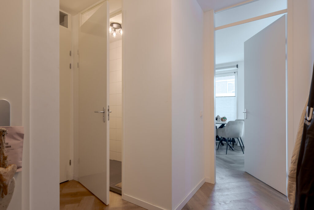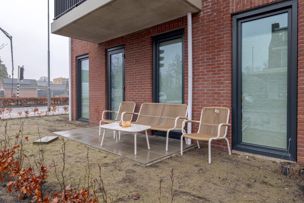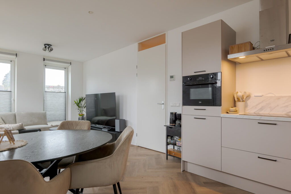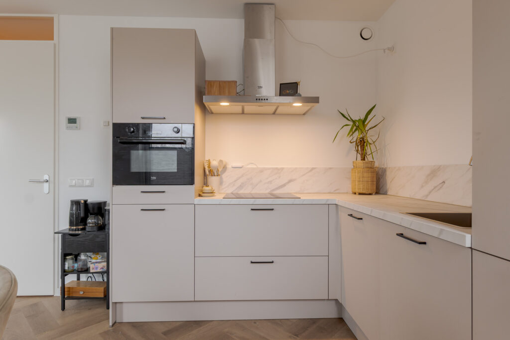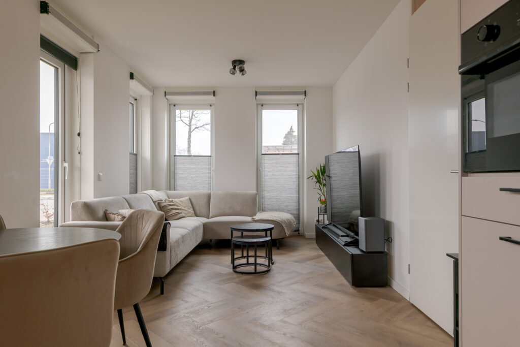 Bij binnenkomst in het appartement betreedt u de hal die toegang biedt tot het separate toilet, de technische ruimte, de badkamer en de woonkamer. De woonkamer met open keuken vormt het hart van het appartement. Dankzij de directe verbinding met het terras aan de voorzijde ontstaat een prettige relatie tussen binnen en buiten. Hier is voldoende ruimte voor een comfortabele zit- en eethoek.