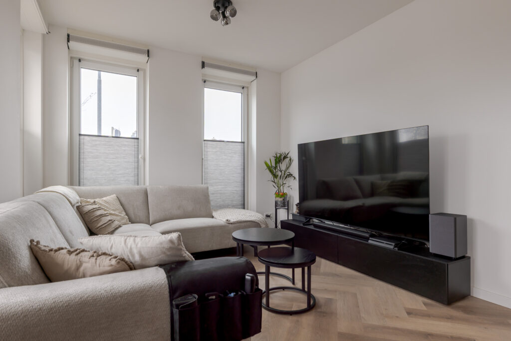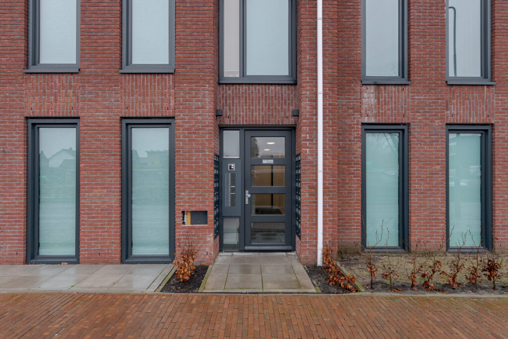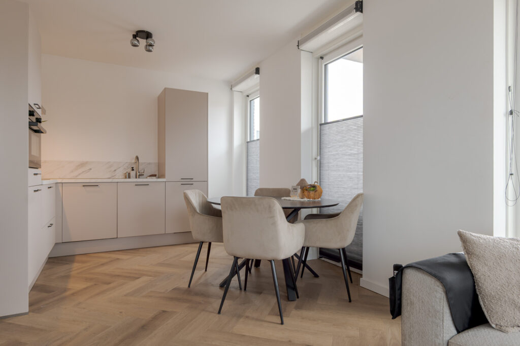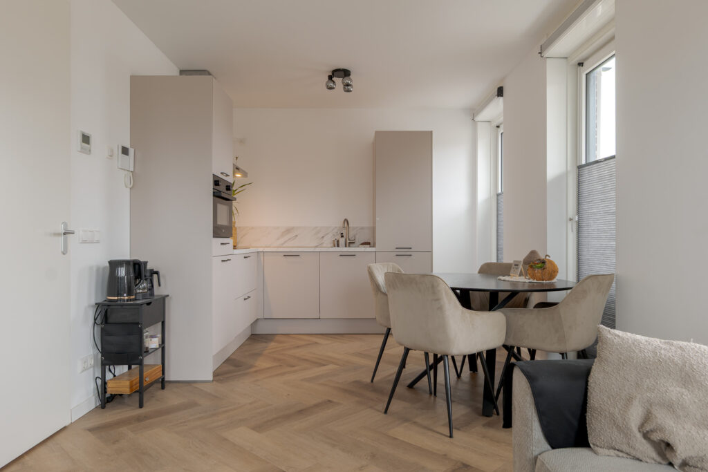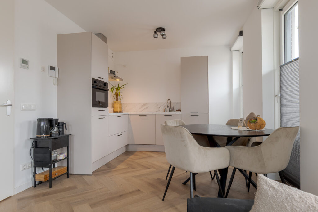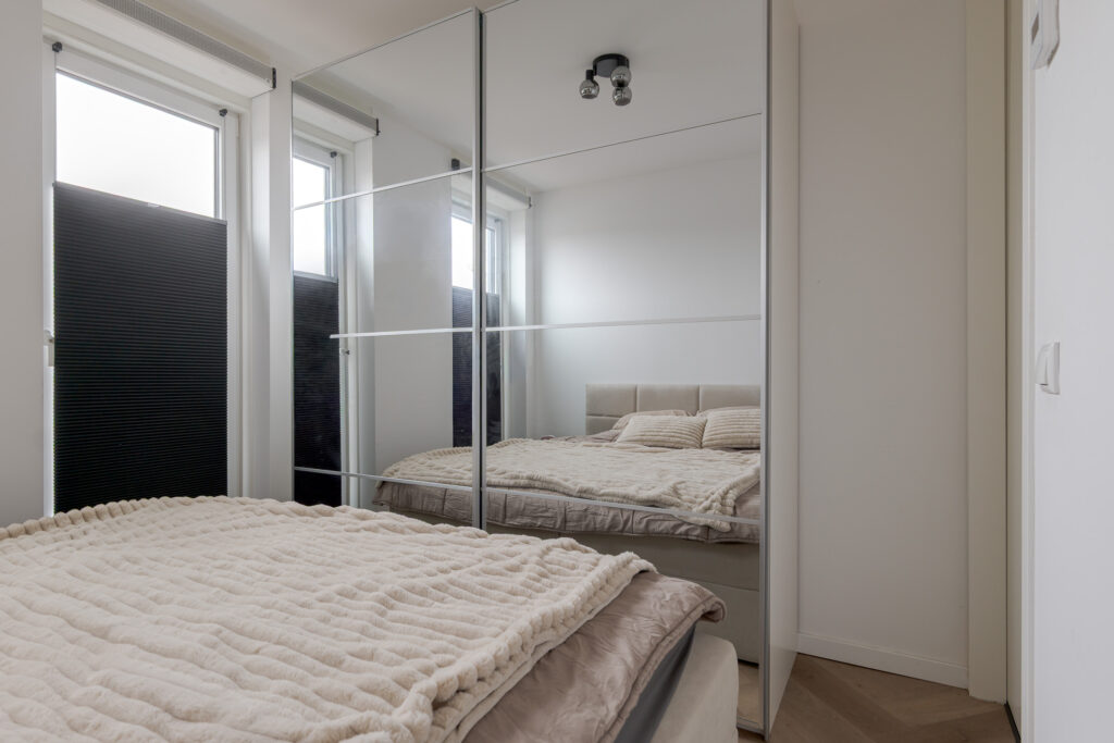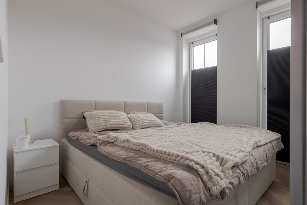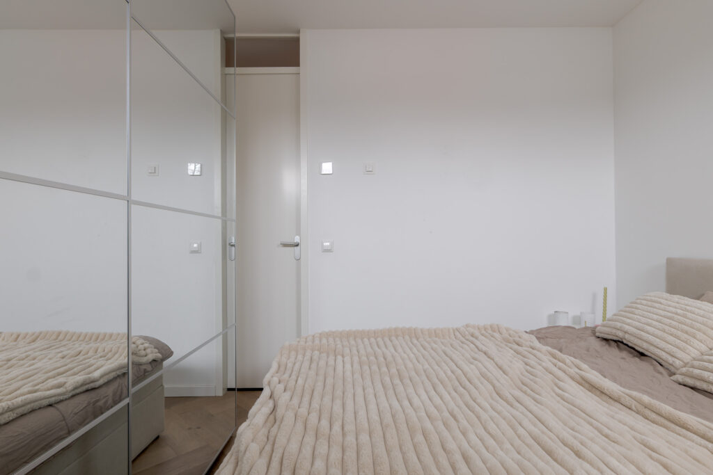 De slaapkamer is praktisch ingedeeld en biedt ruimte voor een tweepersoonsbed en kastruimte. Alles is uitgevoerd in een frisse, eigentijdse stijl passend bij de nieuwbouwuitvoering van het appartement.