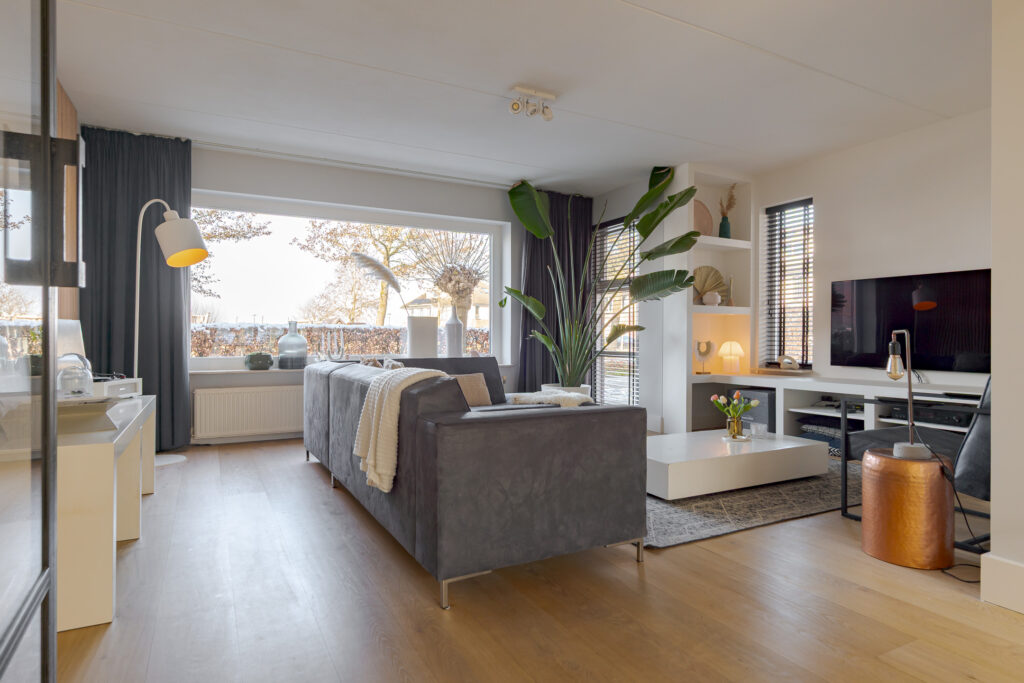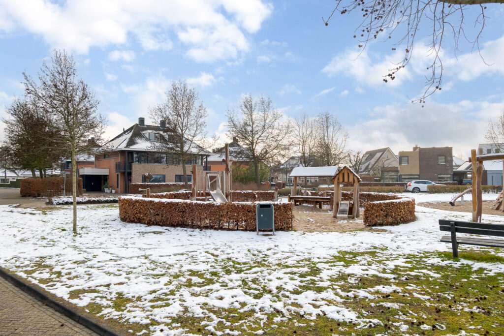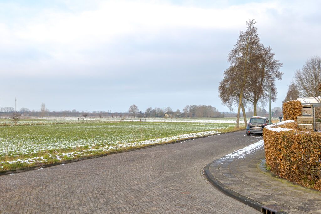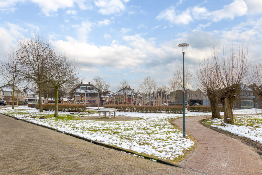 De woonkeuken en de woonkamer zijn van elkaar gescheiden middels dubbele taatsdeuren. Wanneer deze geopend zijn, ontstaat er een fraaie en open verbinding tussen beide leefruimtes; gesloten bieden zij juist de mogelijkheid om wonen en koken op een prettige manier van elkaar te scheiden. De woonkamer is aan de voorzijde van de woning gesitueerd en vormt een comfortabele en rustige zitruimte. Vanuit hier kijkt u uit over de speeltuin, welke direct voor de woning is gelegen, en de verderop gelegen landerijen.