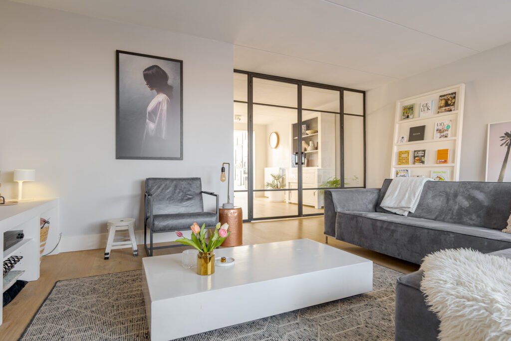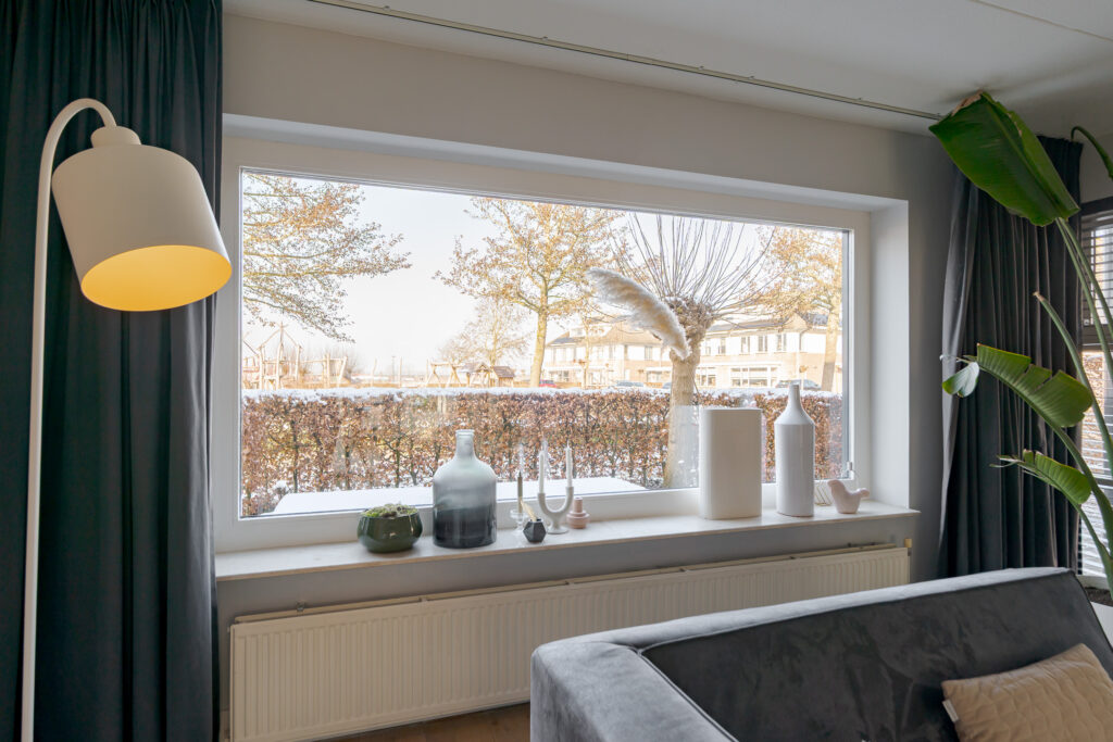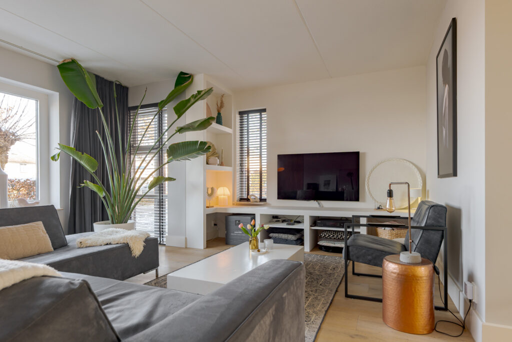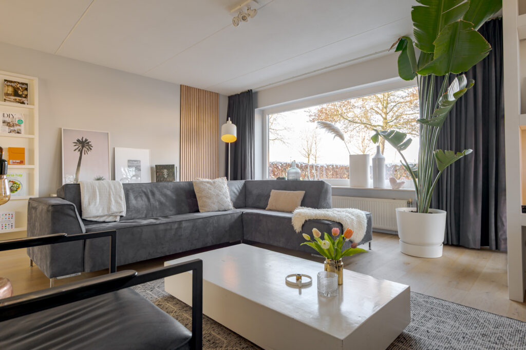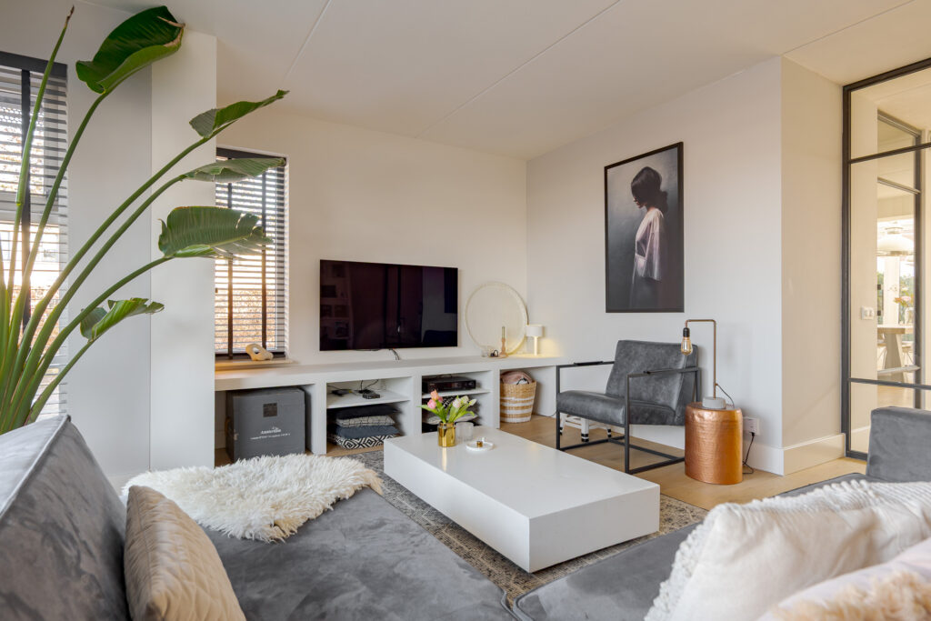 De woonkeuken en de woonkamer zijn van elkaar gescheiden middels dubbele taatsdeuren. Wanneer deze geopend zijn, ontstaat er een fraaie en open verbinding tussen beide leefruimtes; gesloten bieden zij juist de mogelijkheid om wonen en koken op een prettige manier van elkaar te scheiden. De woonkamer is aan de voorzijde van de woning gesitueerd en vormt een comfortabele en rustige zitruimte. Vanuit hier kijkt u uit over de speeltuin, welke direct voor de woning is gelegen, en de verderop gelegen landerijen.