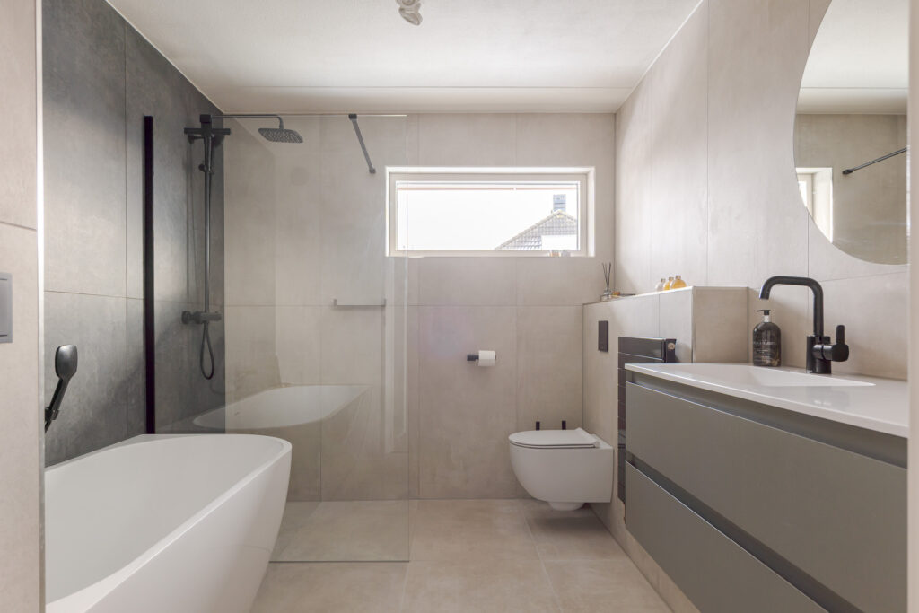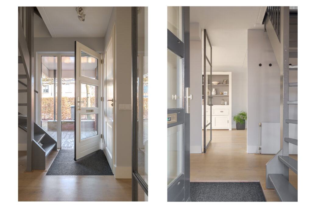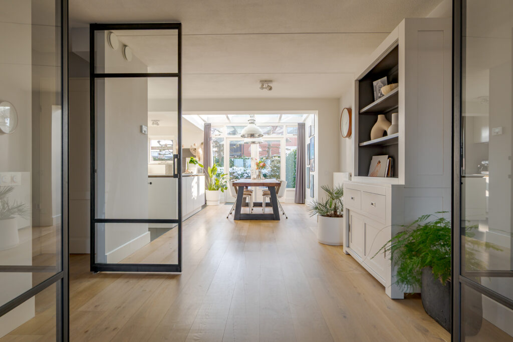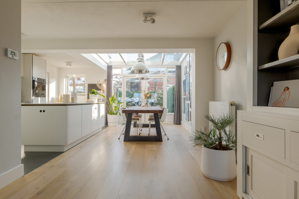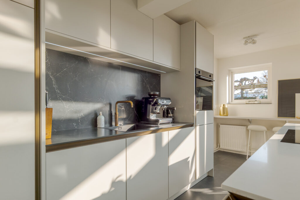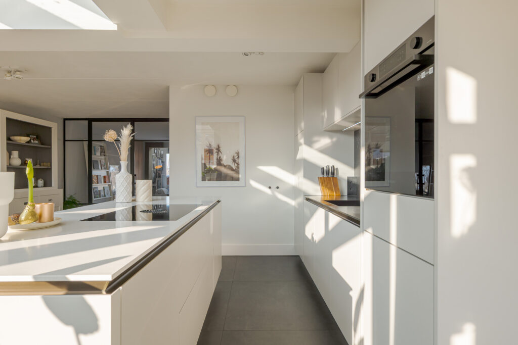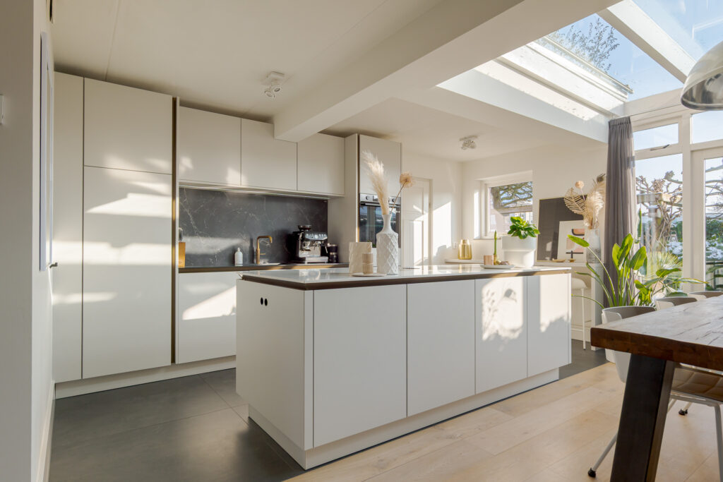 Via de entree komt u binnen in de hal met toilet en trapopgang. Vanuit de hal loopt u direct door naar de woonkeuken, gelegen aan de achterzijde van de woning. Dit is zonder twijfel het hart van het huis. De luxe woonkeuken van SieMatic is modern uitgevoerd in een lichte, rustige kleurstelling en beschikt over een kookeiland en een wandopstelling met inbouwapparatuur. Het werkblad en de achterwand vormen een mooi contrast en geeft de keuken een eigentijdse uitstraling. Het serredak zorgt voor natuurlijk lichtinval, waardoor deze ruimte de hele dag door licht en open aanvoelt. Middels openslaande deuren staat de woonkeuken in directe verbinding met de achtertuin, wat het buitenleven op een vanzelfsprekende manier bij het wonen betrekt. Aansluitend is de bijkeuken bereikbaar, praktisch voor extra bergruimte en huishoudelijke voorzieningen.