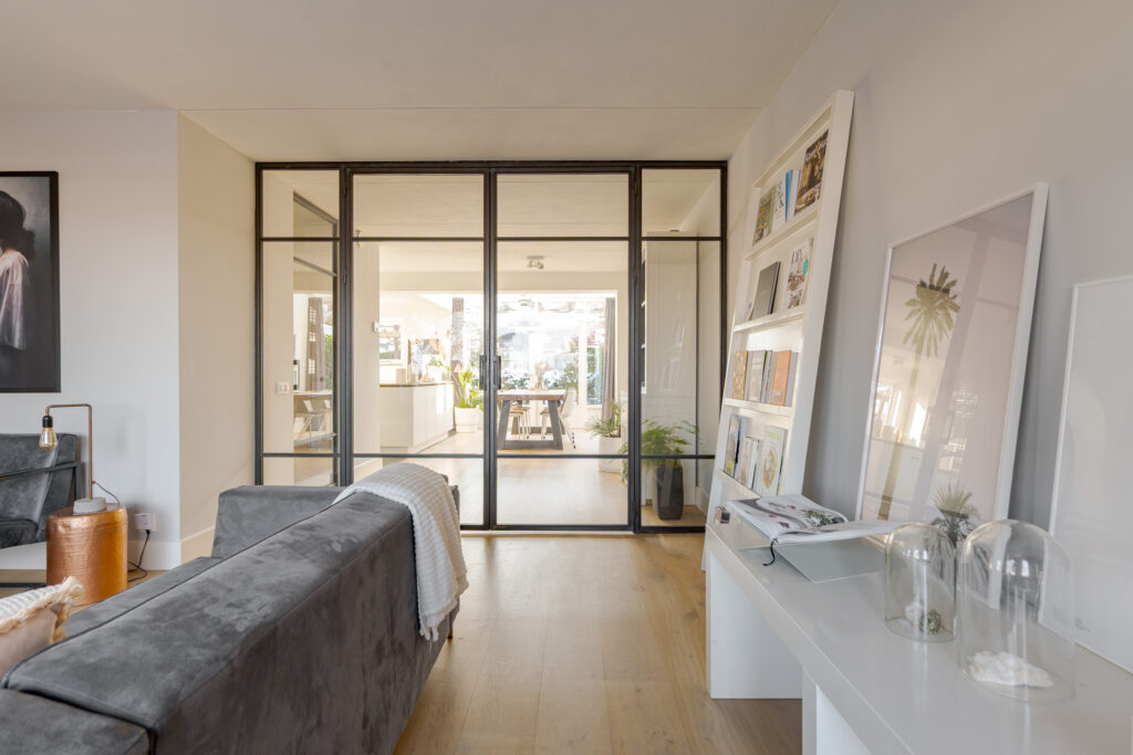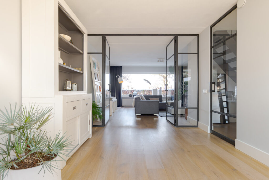 • woonkamer aan de voorzijde, gescheiden door dubbele deuren;