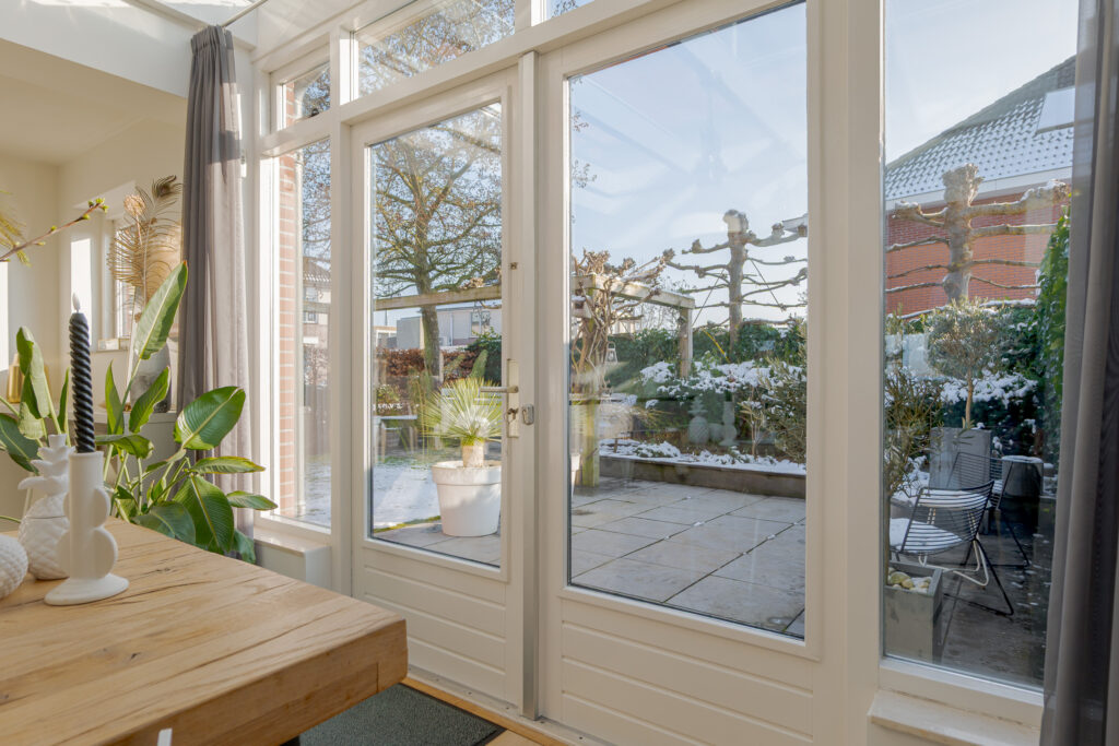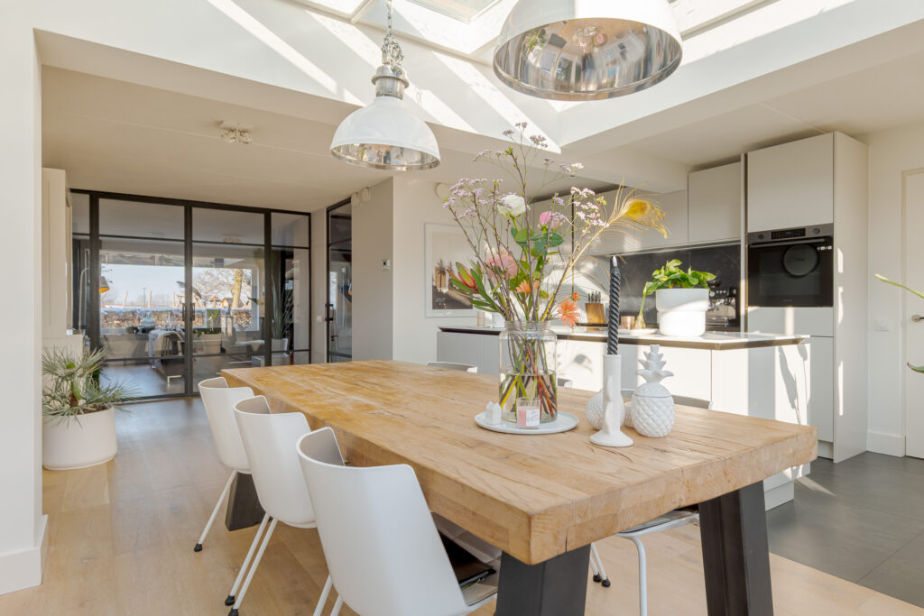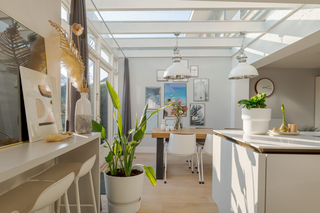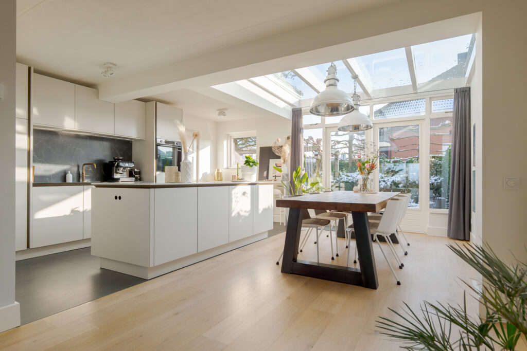• SieMatic woonkeuken aan de achterzijde met serredak en openslaande deuren;